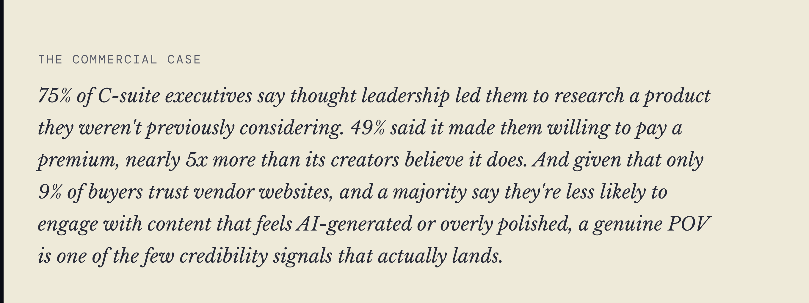 The content that builds a shortlist position is specific enough that the wrong buyer stops reading and the right one forwards it to their team. If everyone nods along, you haven't written a POV — you've written a platitude with a logo on it.