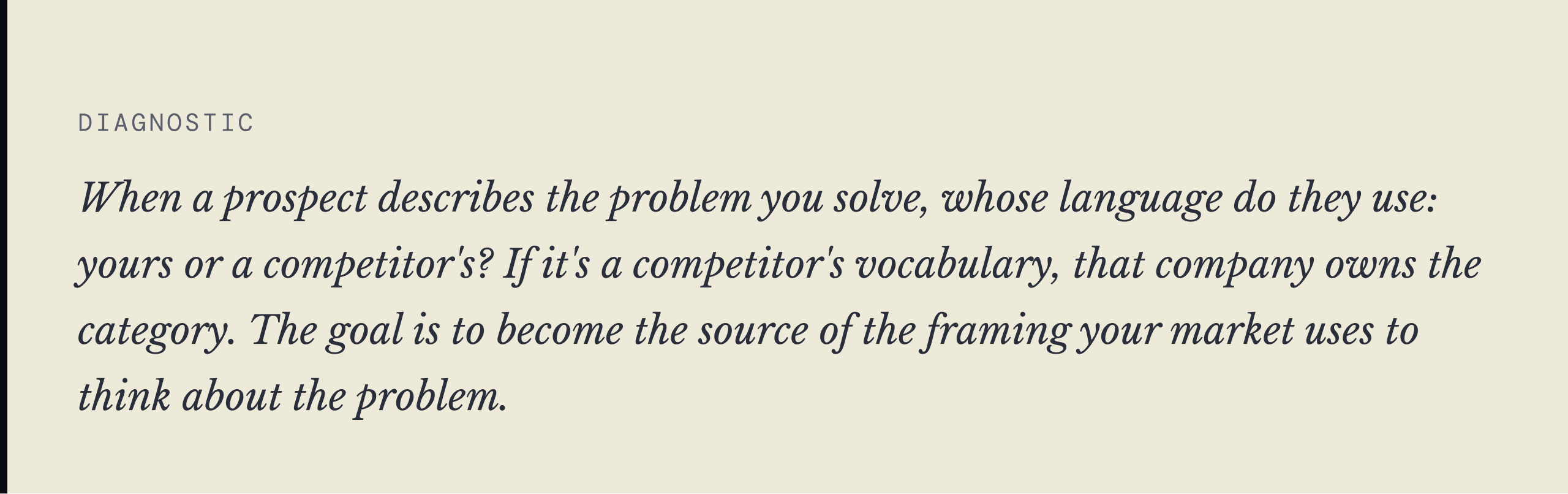 - ✔ Buyers who adopt the frame evaluate competitors through your lens automatically