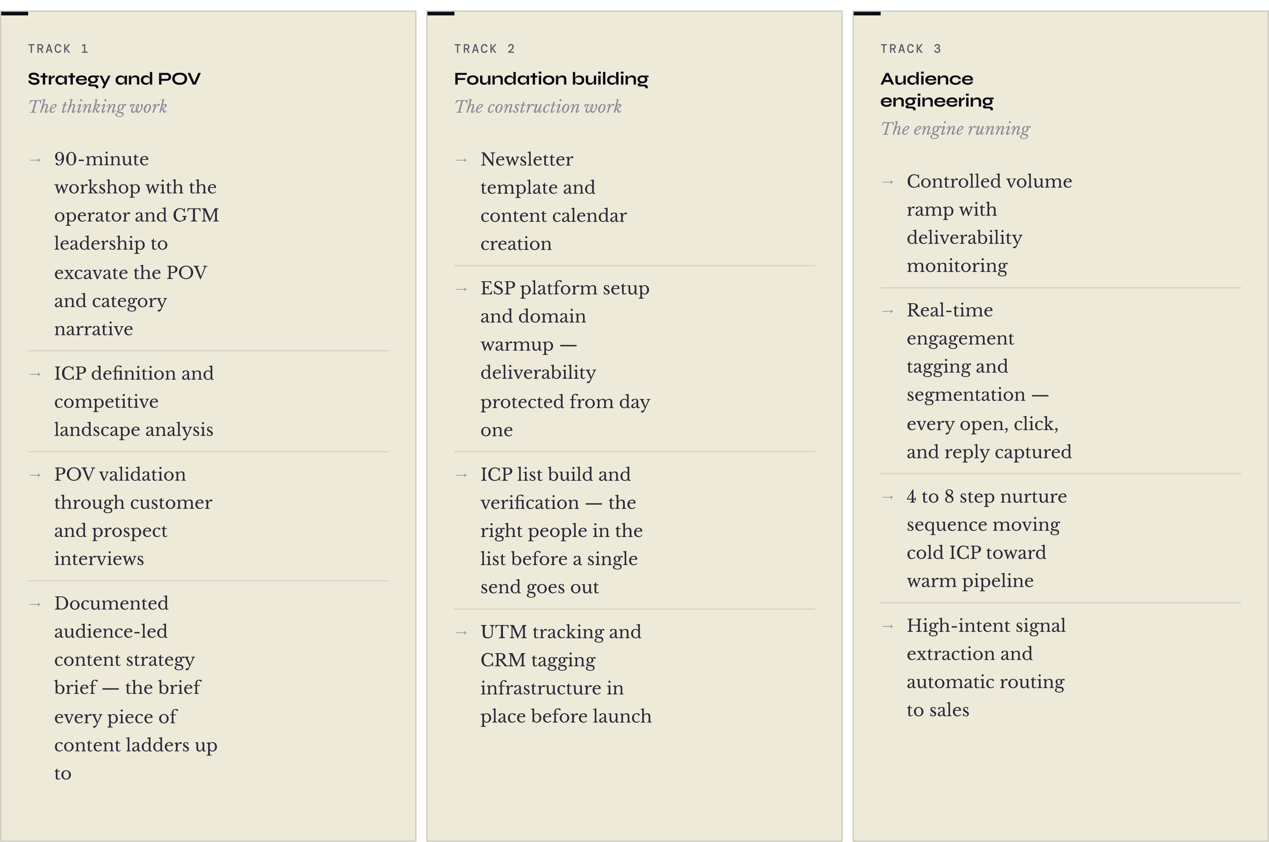 Content is what you say. Audience Engineering is the infrastructure that makes sure the right people hear it — and turns their engagement into pipeline signals your sales team can act on. It runs on three tracks simultaneously.