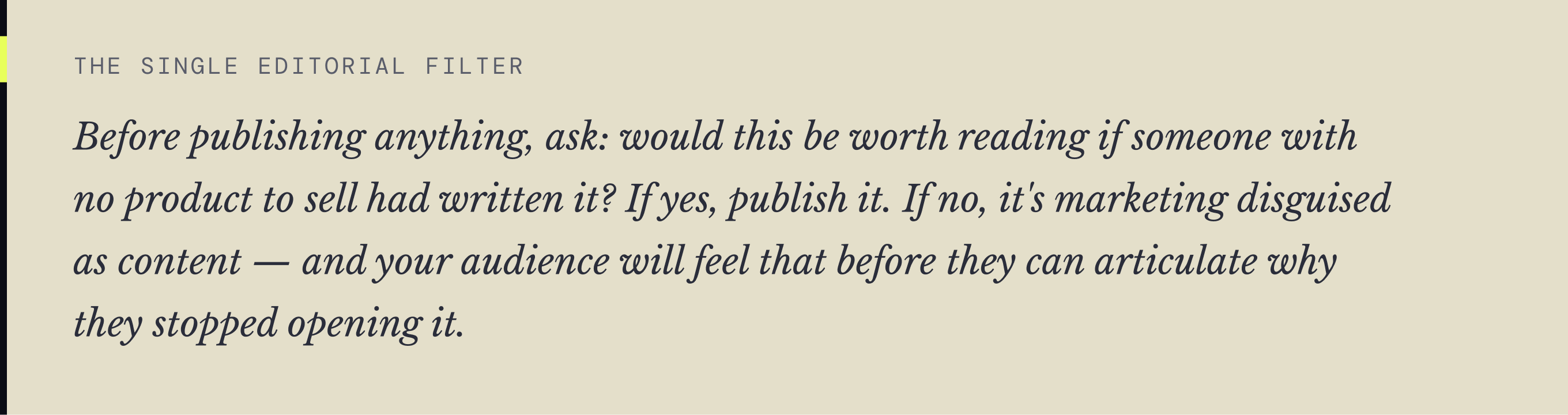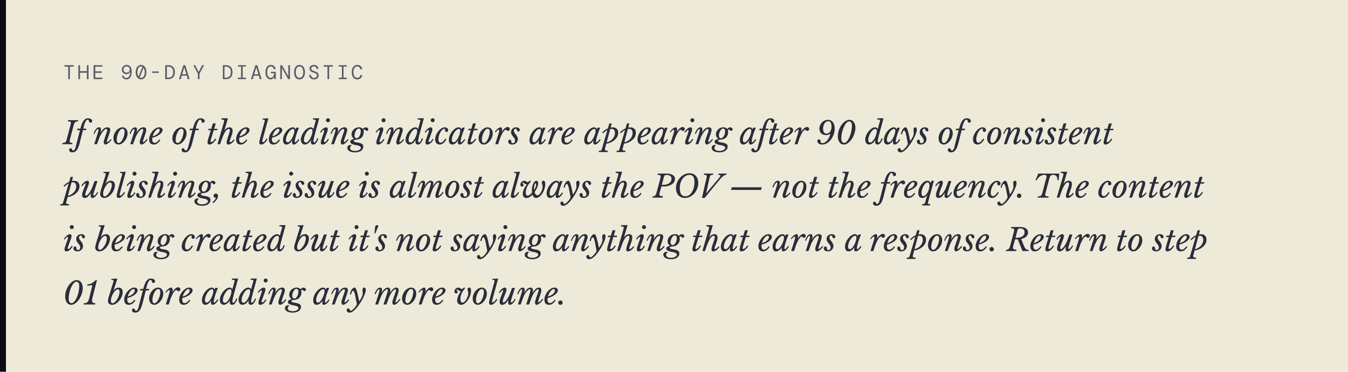 Objections as editotial calendar: Every recurring objection in your pipeline is a topic your audience doesn't have enough context on yet. "We tried content before and it didn't work" is an article. "We need pipeline now,not in six months" is an article. Address them in public beforethey come up in the sales call.
