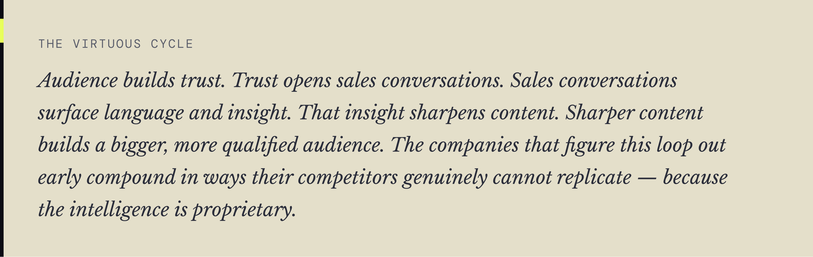 - Content gets sharper — every sales conversation feeds the editorial engine,so each quarter the content is more specific and more resonant than the last