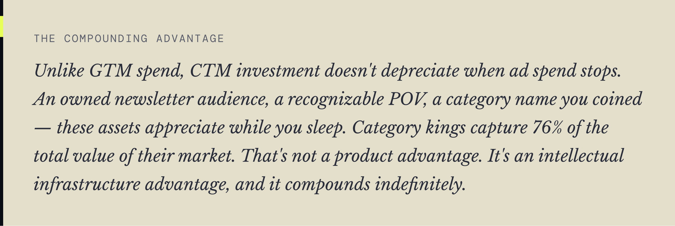 "The category creator sets the evaluation criteria — not just the product. When HubSpot coined 'inbound marketing,' every buyer who adopted that framing was already using HubSpot's vocabulary to think about their problem. That's not a product advantage. It's an intellectual infrastructure advantage. And it compounds indefinitely."