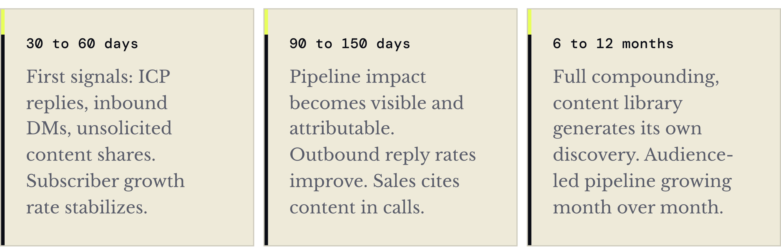Once the first three are working, outbound reaches people who already recognize the name. Sales conversations start with credibility already in the room. You areno longer paying to introduce yourself.