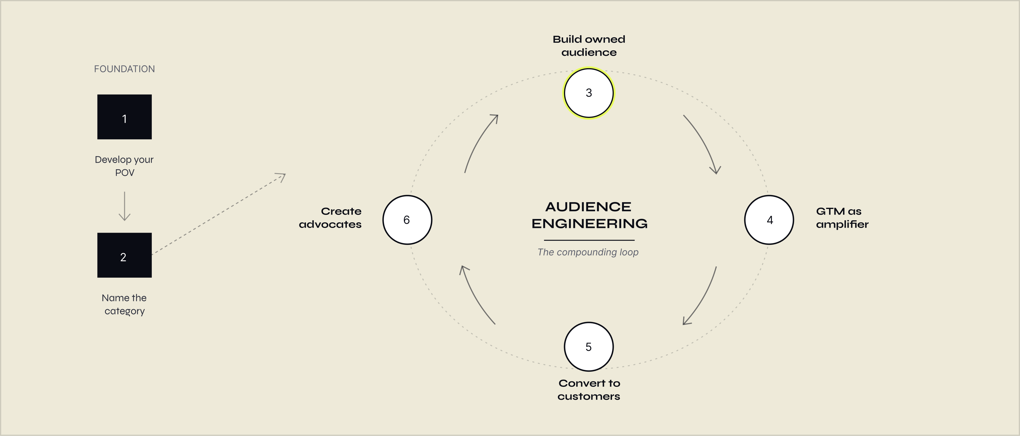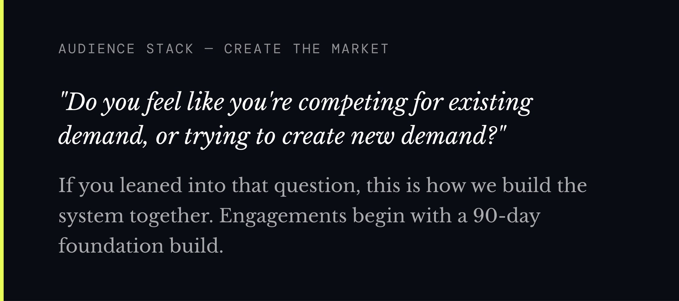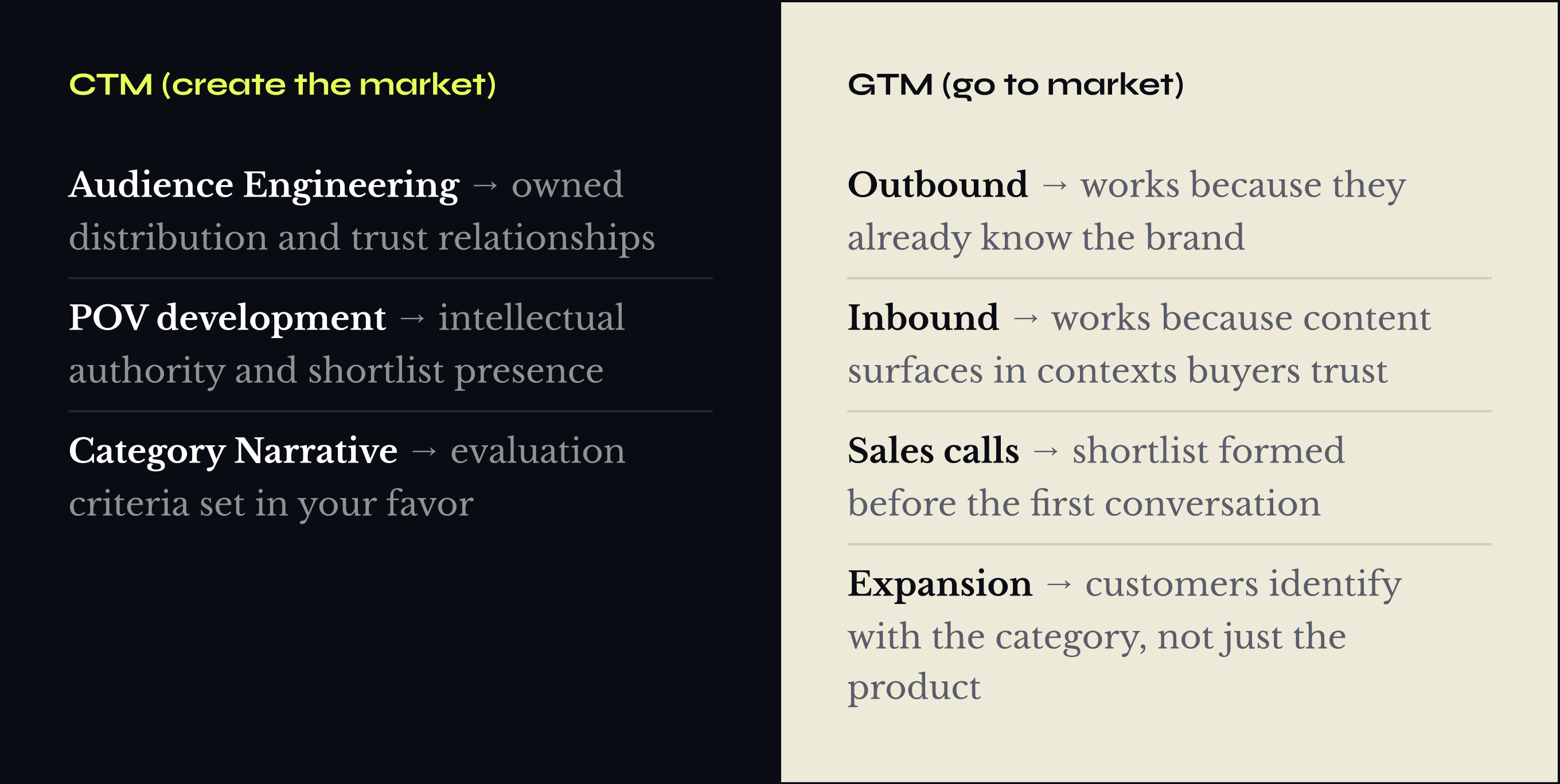 Create the Market (CTM) is the layer that runs underneath GTM. It has three components: Audience Engineering builds owned distribution. Point of View development builds intellectual authority. Category Narrative sets evaluation criteria in your favor — so that when a buyer does their research, they are using your vocabulary to judge every competitor in the room.