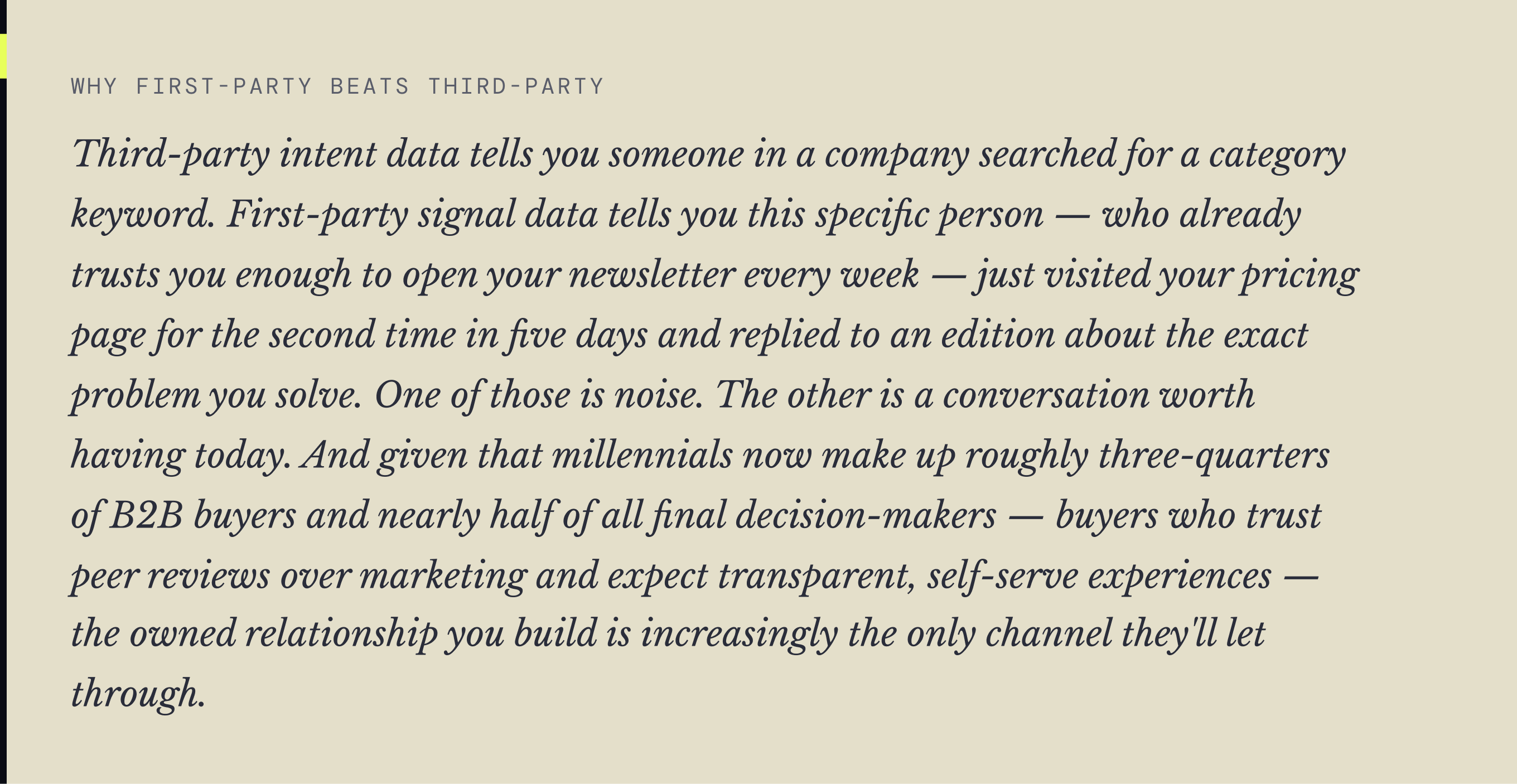 That is not a sales motion. That is what an owned audience does to a pipeline. The mechanism is first-party signal data — behavioral evidence from your own list that tells you exactly who is moving toward a buying decision, what problem they're focused on, and when to reach out. No third-party intent tool required. Your audience tells you.