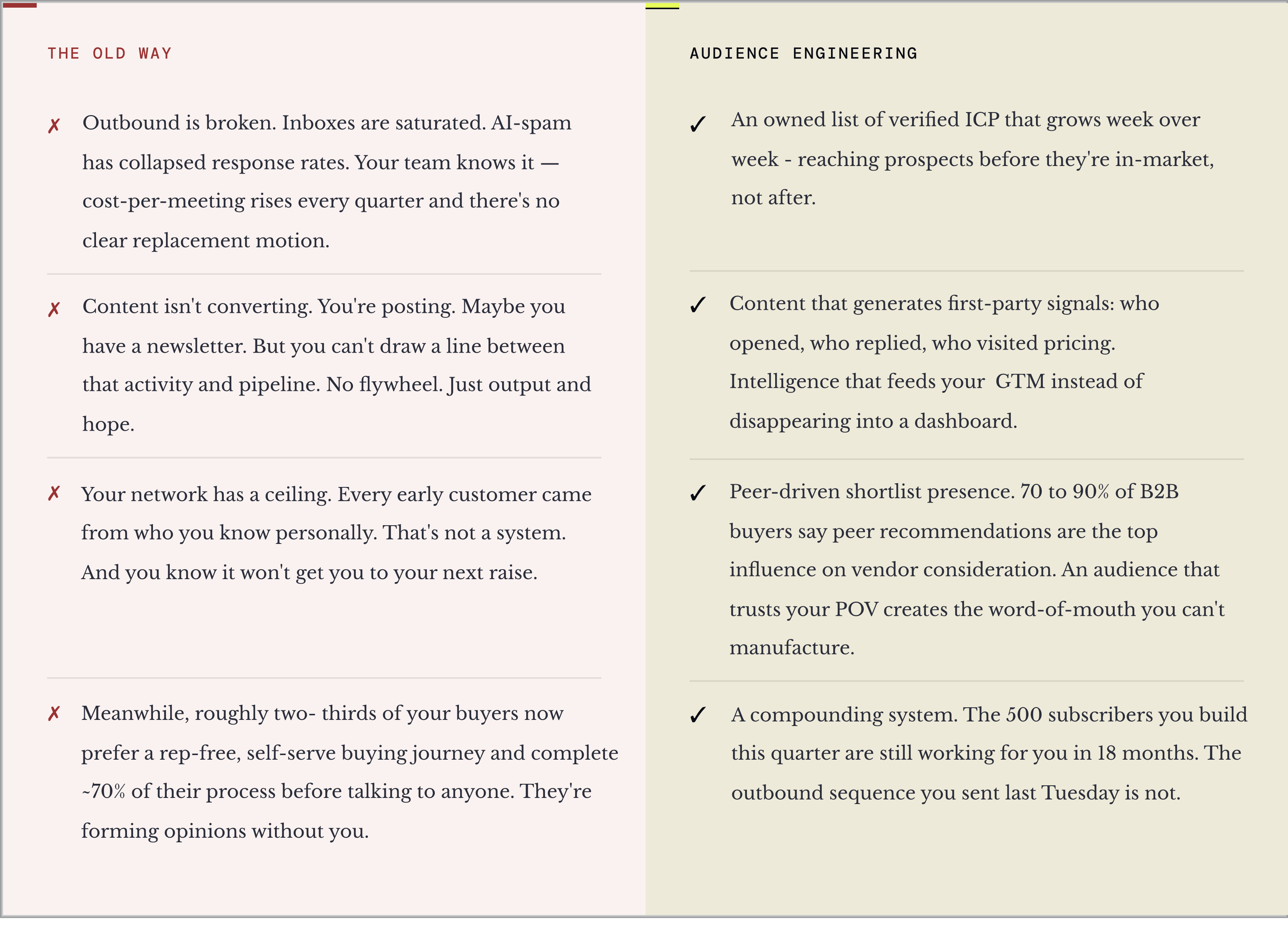 - ✔ "GTM is structurally broken because it optimizes for 17% of the buying journey": specific, challengeable, excludes the wrong buyer