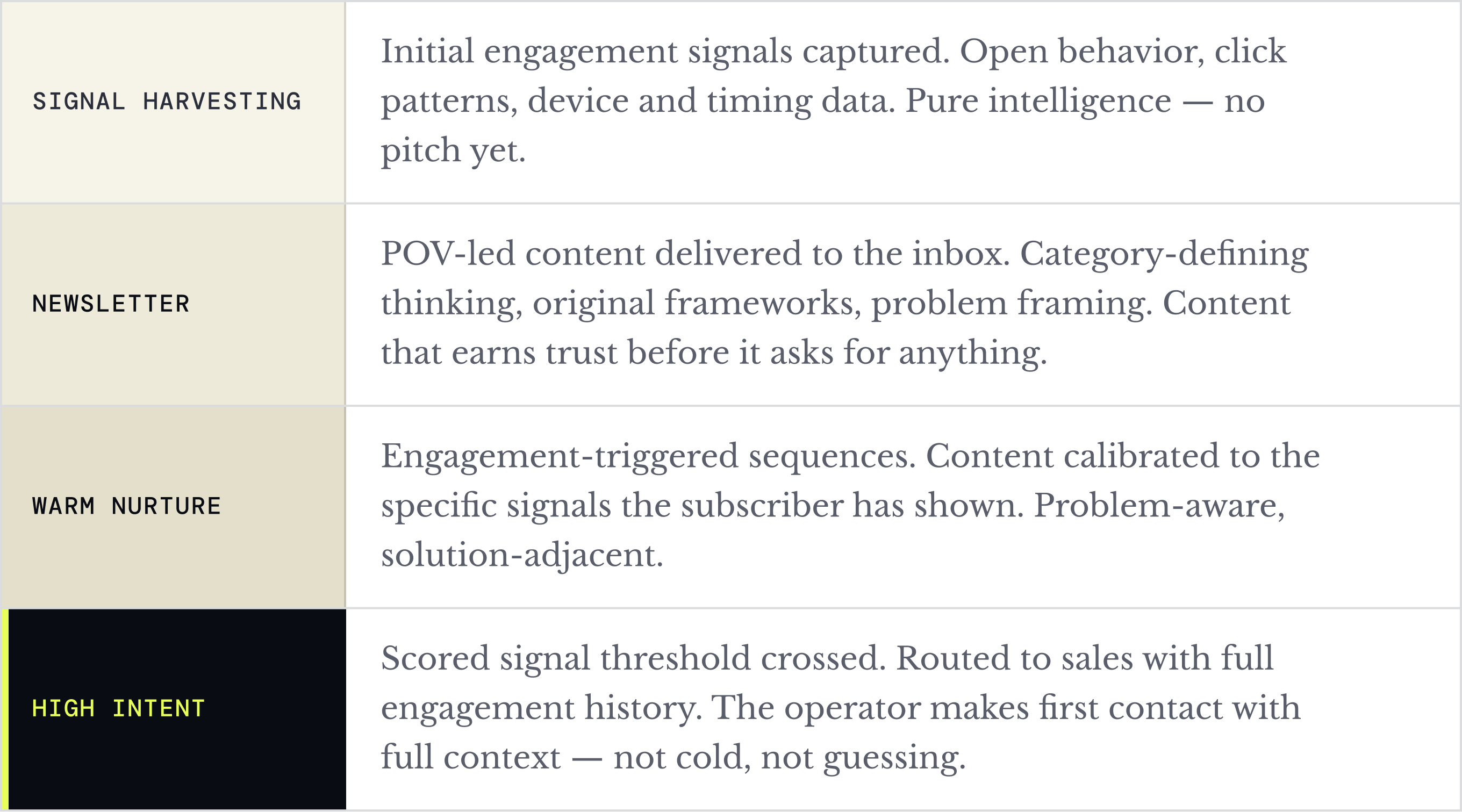 Each new cohort of ICP subscribers moves through the same sequence.Multiple cohorts run in parallel every week, so while one cohort is reaching high intent, a new one is just entering signal harvesting. The engine never idles — each cycle makes the next one sharper.
